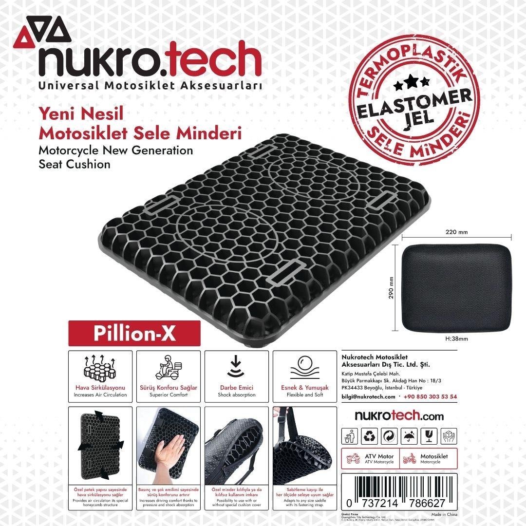 Nukrotech yeni nesil motosiklet sele minderi Elastomer jel malzemeden üretilmiştir. Özel tasarlanmış 3D Petek yapısı sayesinde kalçadaki basıncı dağıtır.